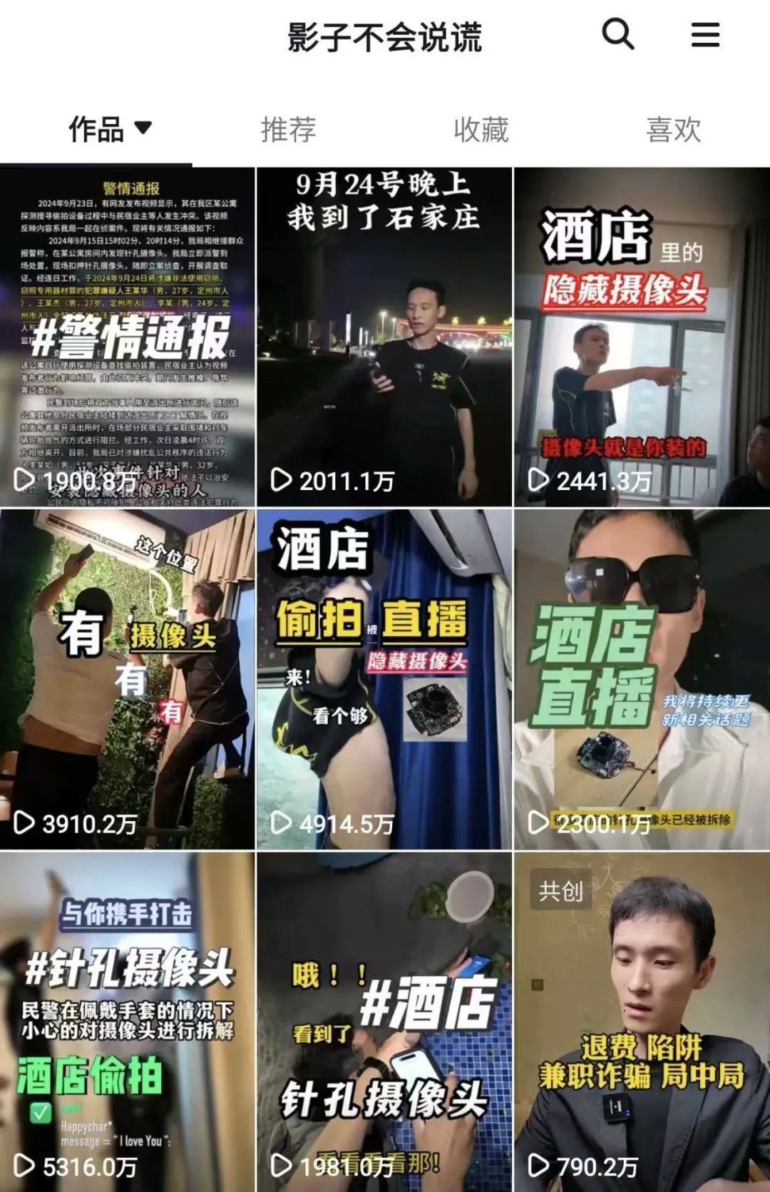 据南方周末记者不完全统计,这一年里,“影子”参与了对石家庄民宿、安阳妇幼保健院、常州试衣间、东莞某酒店、江西某幼儿园等场所偷拍摄像头的“打击”行动,“打击”过程发布在其个人短视频账号上。其中多条视频播放量破千万,多次霸榜热搜,引发舆论关注。不过,上述通报并未点明哪些属于自导自演的剧本。