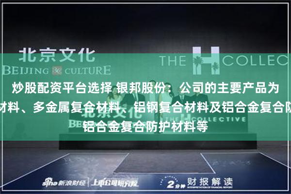 炒股配资平台选择 银邦股份:公司的主要产品为铝热传输材料、多金属复合材料、铝钢复合材料及铝合金复合防护材料等证券日报网讯12月19日炒股配资平台选择,银邦股份在互动平台回答投资者提问时表示,公司的主要产品为铝热传输材料、多金属复合材料、铝钢复合材料及铝合金复合防护材料等炒股配资平台选择,可应用于交通运输、空气分离、电站空冷、工程机械、电力、家用电器、消费电子及储能等领域。