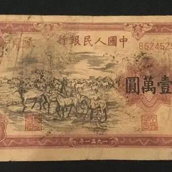 这张纸币是1951年发行的第一套人民币之一,面额为1万元,被称为“牧马图”,是第一套人民币中的珍稀版本之一。